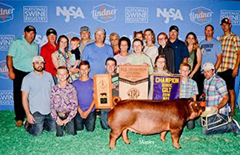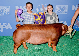 ![]() Grand Champion Gilt Overall & Champion Duroc Gilt 2018 Don Rodeffer Classic, IN 2018 Delaware County Classic, IN Grand Champion Duroc Gilt & 3rd Overall 2018 Purdue Block & Bridle Show, IN Shown by Cagney Utterback Bred by Mark Hoge Sired by Bohannon |