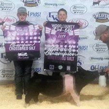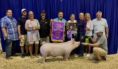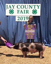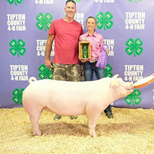 Grand Champion Barrow & Champion Crossbred 2019 Tipton County Fair, IN Shown by Brooklyn Day Bred by Chad Day Showpigs Sired by Get It On |