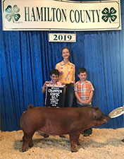 Grand Champion Chester Gilt 2019 Tipton County Fair, IN Shown by Keliah Smith Bred by Chad Day Showpigs Sired by Out of the Box |