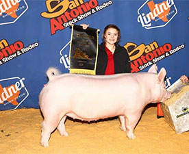 Reserve Champion Spot Gilt 2019 San Antonio Stock Show Jr. Show Shown by Holly Alderson Bred by Brattain Farms Sired by Mayweather |