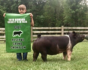Reserve Champion Purebred Gilt 2019 Cumberland County 4-H Fair Shown by Wyatt Huddleston Bred by Hughes Showpigs, IL Sired by Unforgettable |